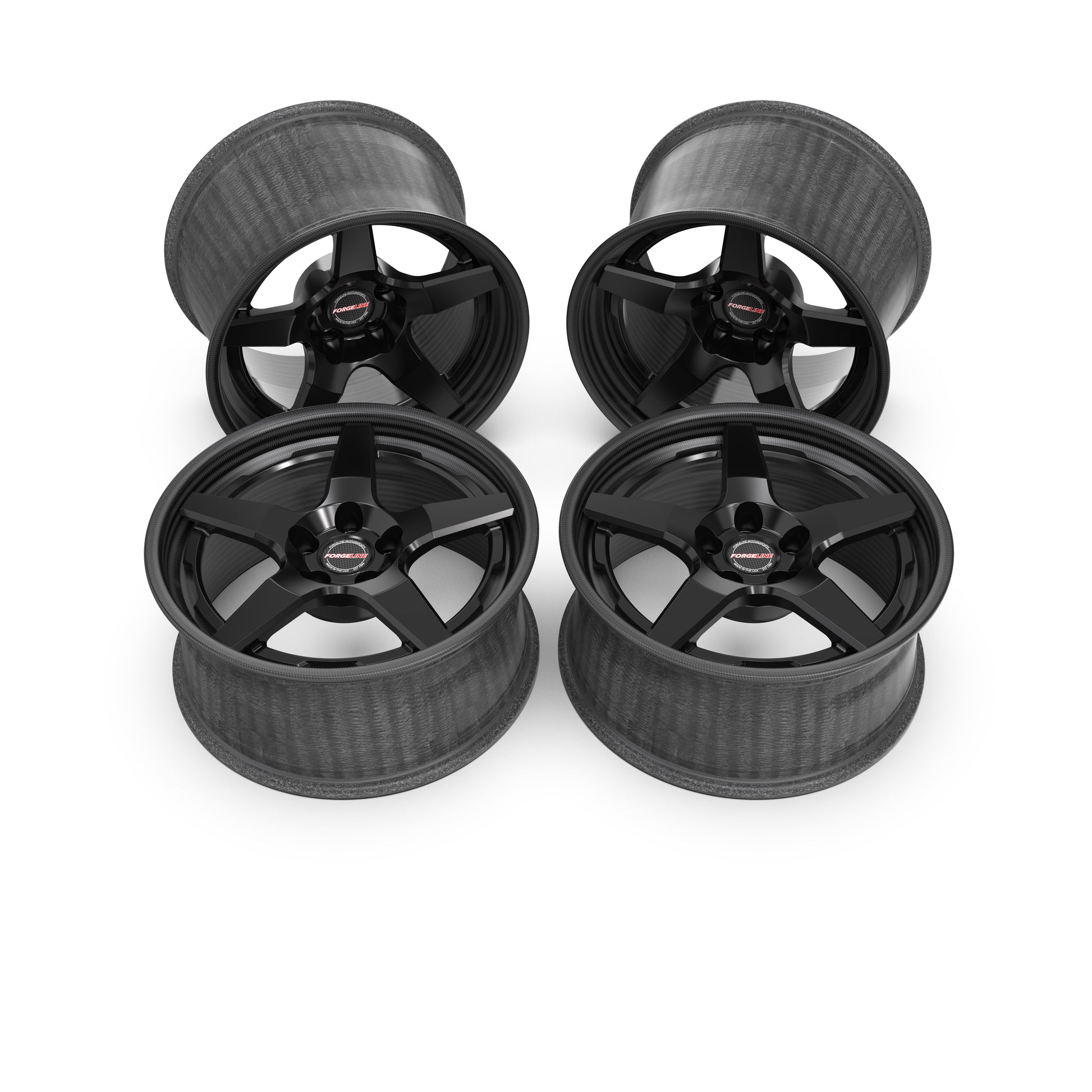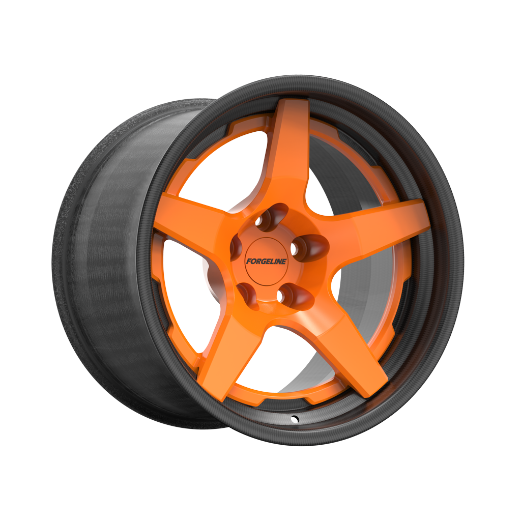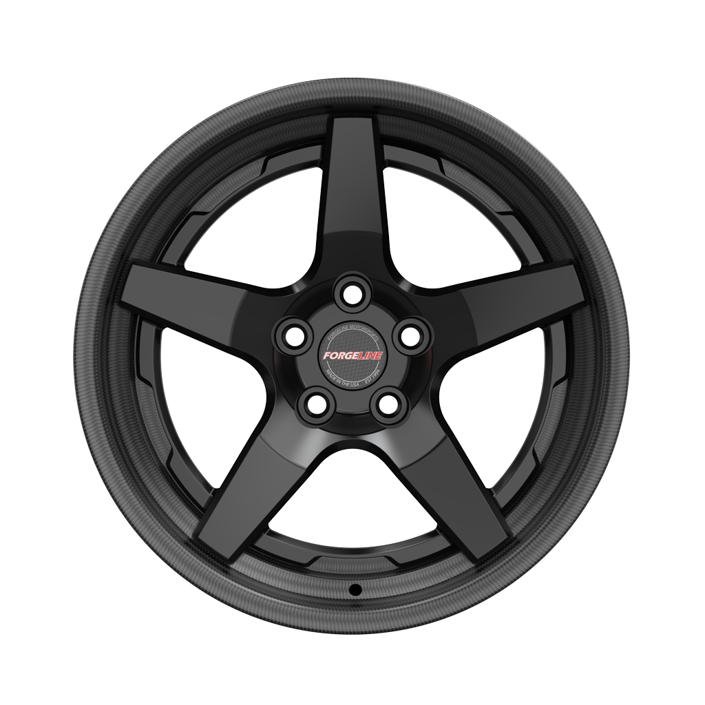 The lightweight Carbon+Forged LCF200 wheel combines a weight-optimized CNC-machined forged aluminum center with a revolutionary proprietary Lacks Enterprises carbon fiber barrel to deliver the ultimate in technological advancement, exclusive styling, and unparalleled performance. The LCF200 combines its carbon fiber barrel with a unique precision-machined forged 6061-T6 aluminum center featuring five muscular spokes with strong chamfered machining details to yield a wheel with absolutely impressive performance metrics: very low static mass, very low rotational inertia, minimal deflection, and excellent fatigue strength!